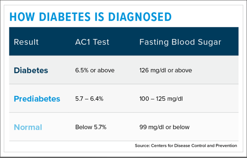 Think of prediabetes as a warning: Your blood sugar is higher than it should be – but not high enough for a type 2 diabetes diagnosis, according to the American Diabetes Association (ADA). That means your fasting blood sugar level is 100 mg/dL to 125 mg/dL. Your A1C, which is an average measure of your blood sugar over the past three months, is probably between 5.7% and 6.4%. Anything above those upper ranges is considered type 2 diabetes, according to the Centers for Disease Control and Prevention (CDC).